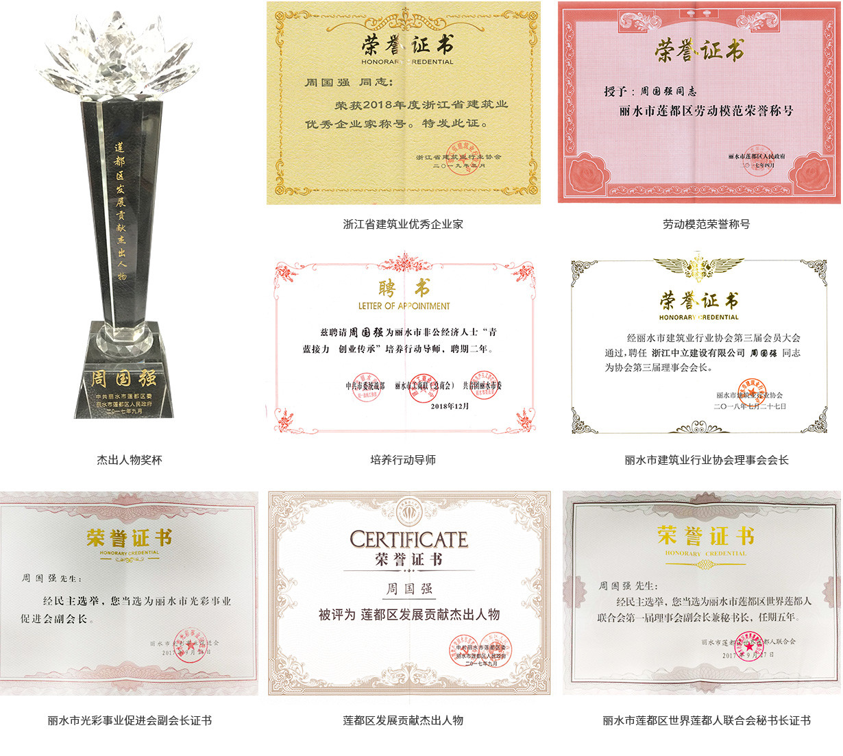 2018年7月當選為麗水市建筑業(yè)行業(yè)協會理事會會長,2019年3月被浙江省建筑業(yè)行業(yè)協會評為2018年度浙江省建筑業(yè)優(yōu)秀企業(yè)家。