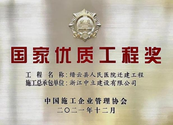 我公司承建的縉云縣人民醫院遷建工程榮獲2020—2021年度國家優質工程獎。這是中立獲得的第一個國家優質工程獎項目,也是麗水本地企業第一個獲國家優質工程獎項目。